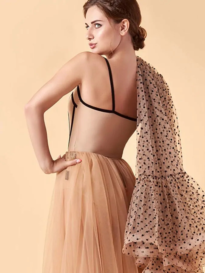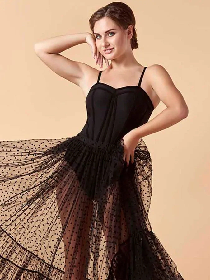 Body taneczne SIMONE  imitujące gorset. Model bez rękawów na cienkich ramiączkach, ozdobiony welurową elastyczną taśmą , co pięknie podkreśla sylwetkę. Materiał - cienki elastyczny mikropoliamid (90% poliester, 10% elastan) Przód ma podwójną warstwę. Głęboki dekolt. Półotwarte plecy. Bez zapięcia. Pranie delikatne w temperaturze 30°